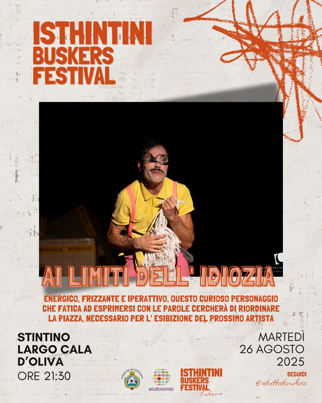 Energia incontenibile e comicità surreale.Un personaggio iperattivo, stralunato e incapace di comunicare con le parole tenterà di riordinare la piazza per l’artista successivo… con esiti del tutto imprevedibili!Vi aspettiamo martedì…